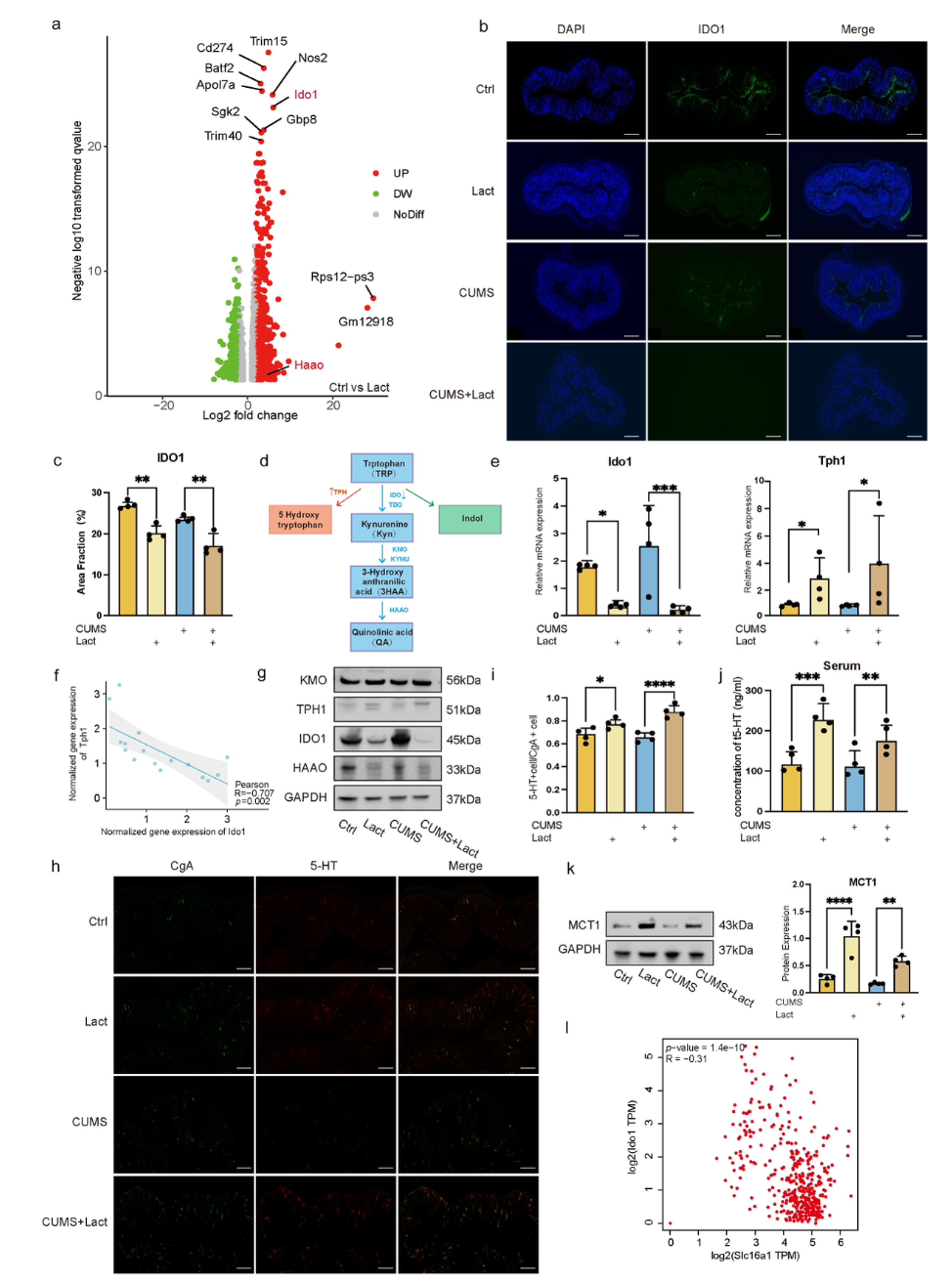 2. 乳酸促进色氨酸向5-HT的代谢转化。为了验证乳酸是否对焦虑产生直接影响,研究者建立了小鼠慢性焦虑模型,并通过乳酸处理进行干预。焦虑小鼠的结肠基因表达差异化分析显示,乳酸改善了色氨酸代谢路径中的两个重要的酶的表达水平:色氨酸羟化酶1(TPH1)的表达水平显著上调,吲哚胺2,3-双加氧酶1(IDO1)的表达水平显著下调。同时小鼠血清中的5-HT水平显著提高。总的来说,乳酸显著改善了小鼠的焦虑水平,并使得肠道色氨酸的代谢方向偏向了5-HT的生成。