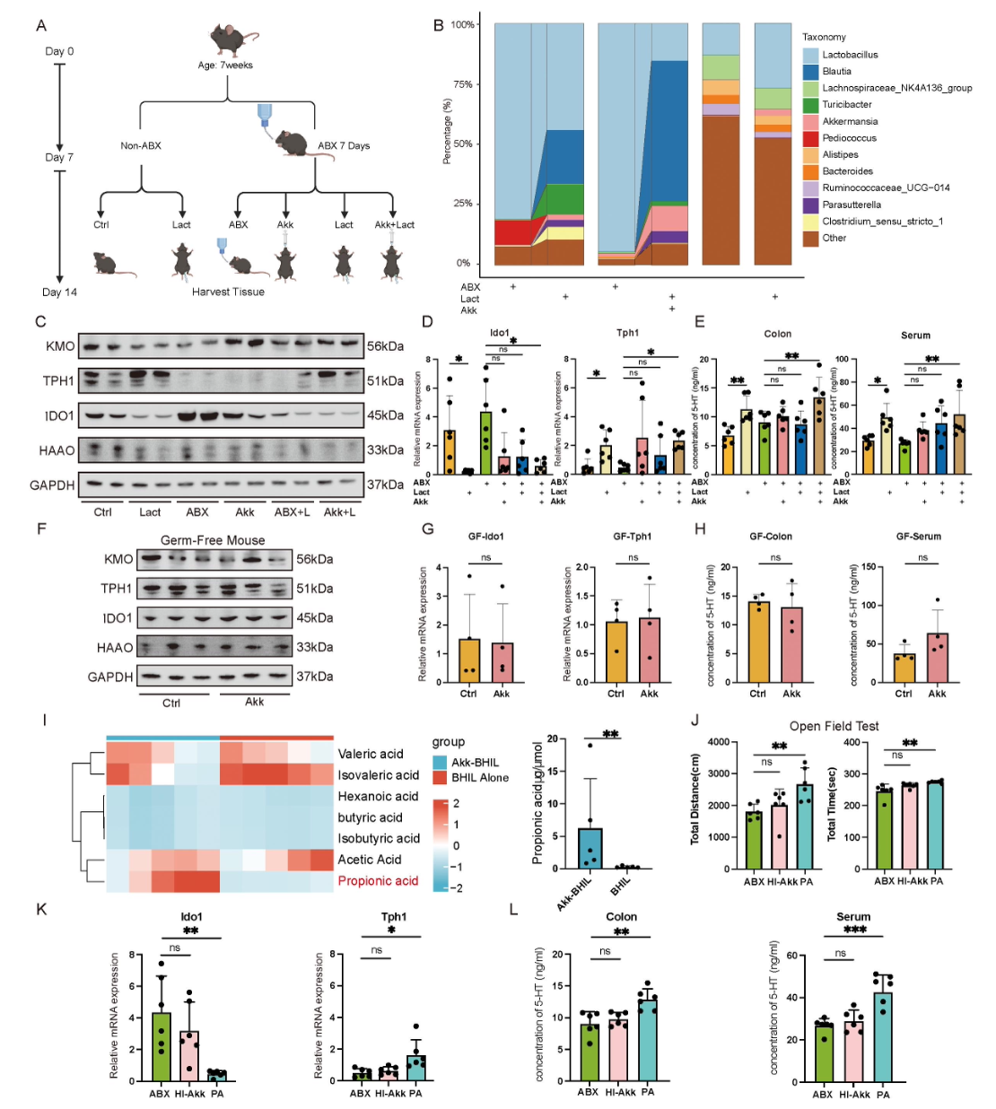 3. 乳酸和A. muciniphila共同调节色氨酸代谢。为了探索乳酸的有益的影响是否涉及微生物的参与,研究人员对抗生素处理的减菌小鼠和无菌鼠进行乳酸和A. muciniphila干预,结果显示无菌或减菌状态下单独给予乳酸或A. muciniphila均无法调节IDO1和TPH1的表达,而乳酸和A. muciniphila共同补充能够显著改善两种限速酶的表达,并提升5-HT的水平,这表明A. muciniphila在乳酸调控焦虑的过程中具有重要的协同作用。