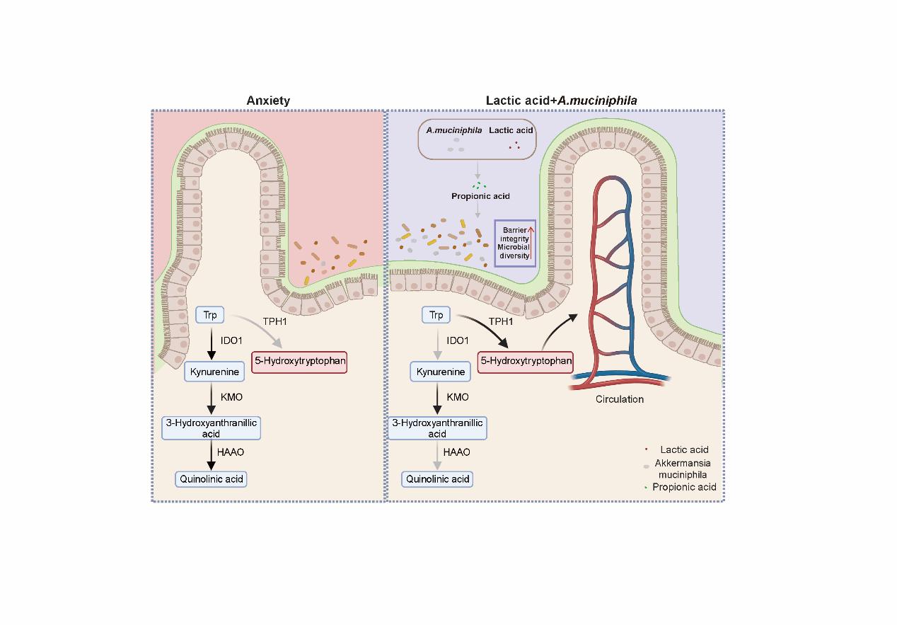 本研究从肠道微生物与代谢物的协同作用角度,揭示了乳酸与A. muciniphila通过调节色氨酸代谢路径促进5-HT合成,从而缓解焦虑的重要机制,打开了通过肠道微生物改善情绪健康的大门。
