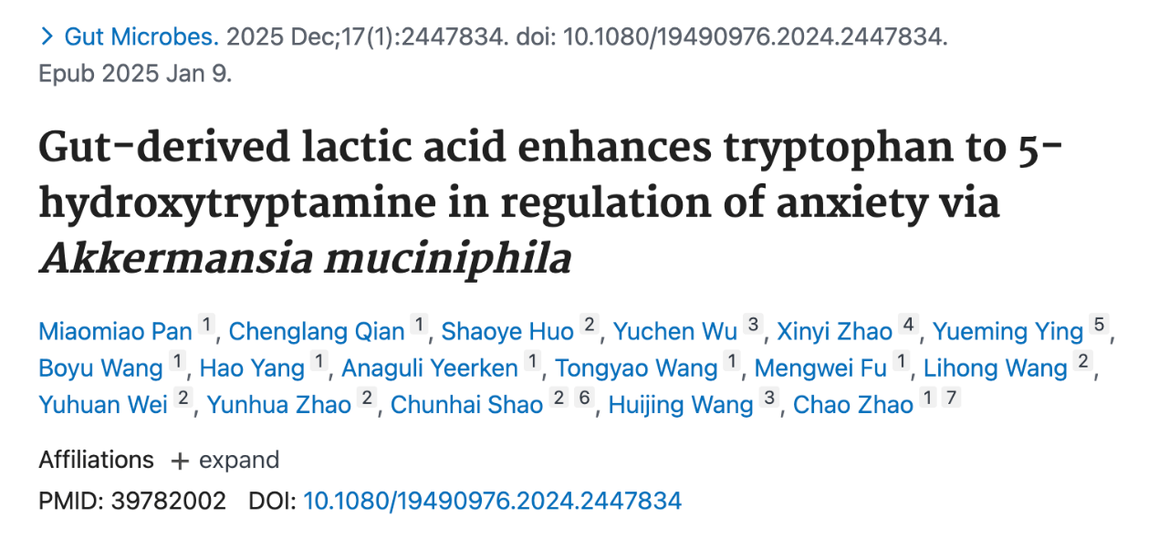 近期,williamhill官网病原生物学系、医学分子病毒学教育部/卫健委/医科院重点实验室赵超团队在国际知名学术期刊Gut Microbes上发表了题为“Gut-derived lactic acid enhances tryptophan to 5-hydroxytryptamine in regulation of anxiety via Akkermansia muciniphila”的最新研究(Pan M, Qian C, Huo S等,2025),深入探讨了肠道微生物Akkermansia muciniphila(A. muciniphila)与乳酸协同缓解焦虑的新机制。
