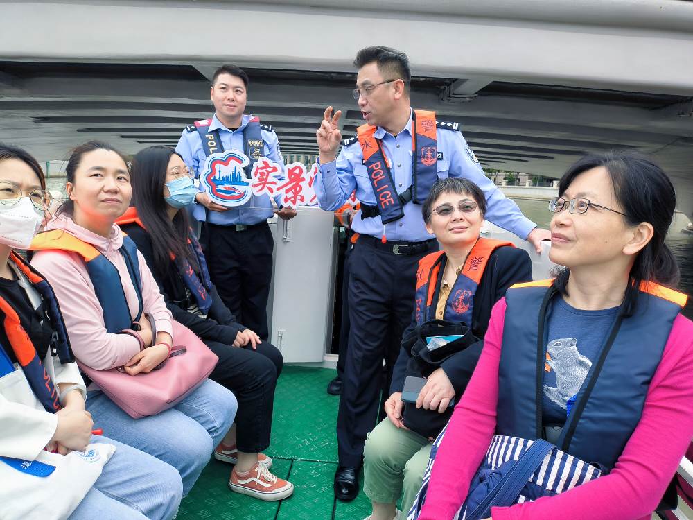 实景党课从莫干山公安码头出发,一船向东,途径普陀、静安、黄浦、虹口4个区,苏州河河畔一幢幢历史建筑、一座座桥梁,在苏州河水上派出所民警的生动讲解下,徐徐展现了一本波澜壮阔的红色革命史,艇上所有党员民警、师生一路探寻,细细品味苏州河的红色精神。