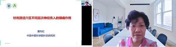 北京中医科学院的景向红研究员就“针刺激活穴区不同层次神经传入的镇痛作用”做详细讲解。景向红研究员指出,真假针刺的镇痛效果和患者的疼痛状态相关,针灸医生根据患者的疼痛状态来判断针刺深浅程度,及采用何种针法。闸门学说和上位中枢的下行抑制为针刺镇痛的理论基础,景向红研究员进一步讲解了针刺镇痛机制的最新发现。