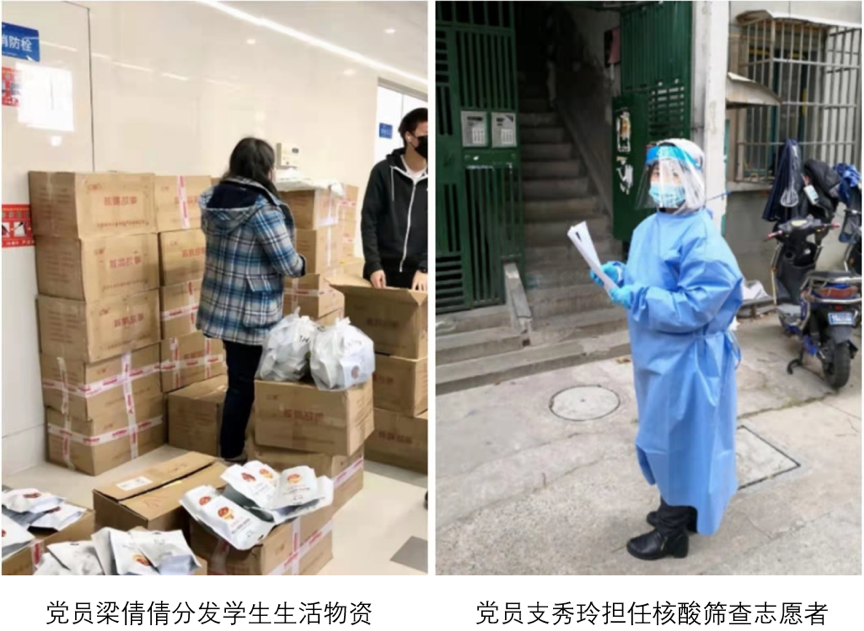支部委员向萌老师和党员夏春梅老师带领学工队伍,与学生并肩作战;支部委员周莉老师积极与校内外师生沟通,保障各项工作有序进行。支部党员梁倩倩和雷宇老师,主动承担系室第二轮值班工作,梁倩倩老师担任志愿者值守校园接驳车站点,维护核酸检测秩序,给同学们送餐和生活必需品。