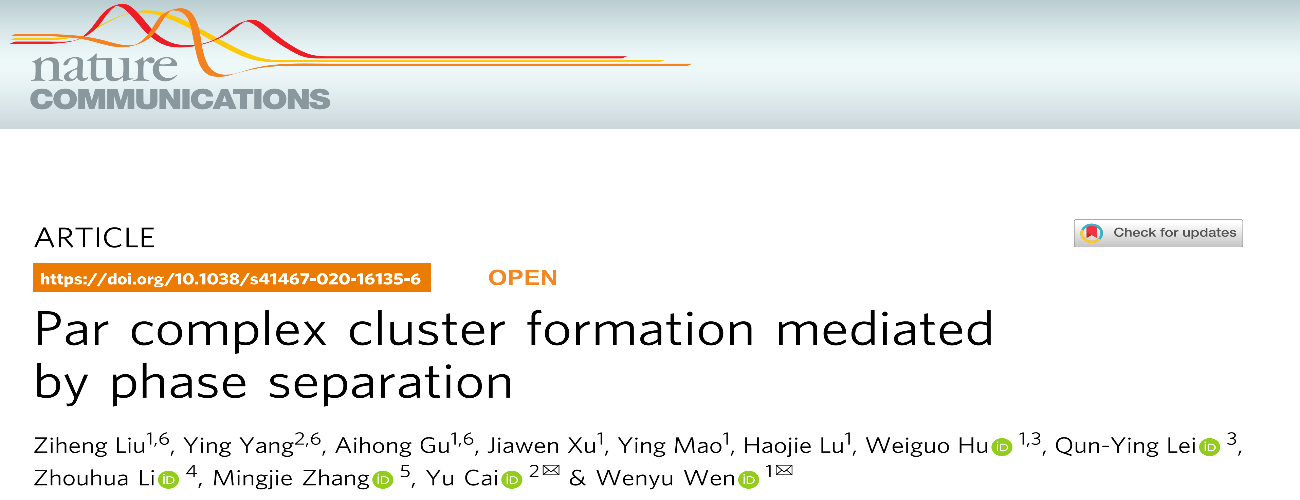 2020年5月8日,我院温文玉组和蔡毓组再次合作,在Nature Communications杂志上在线发表了题为“Par complex cluster formation mediated by phase separation”的研究工作,发现神经干细胞不对称分裂过程中,Par蛋白复合物(Par3/Par6/aPKC)也是通过相分离的方式进行组装,进而调控顶-底细胞极性轴的建立以及神经元的分化。研究者进一步提出,极性蛋白复合物多价相互作用介导的液-液相分离可能是细胞极性建立的普遍机制。