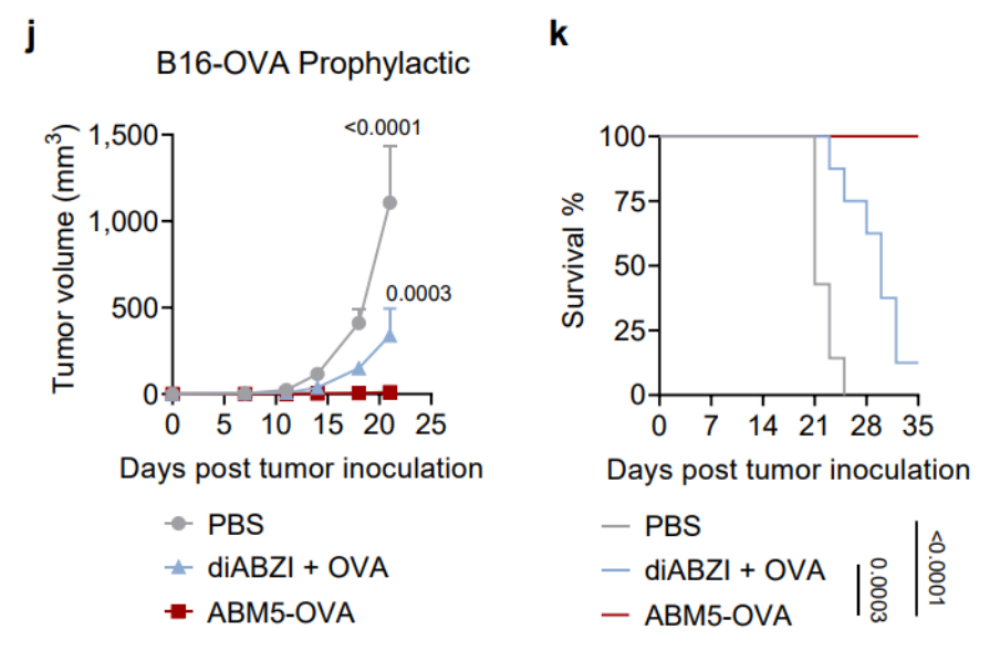 为了评估SABER疫苗设计增强的CD8+T细胞应答在抗肿瘤免疫中的作用,作者从一系列对ABM5-OVA(羧基 端偶联卵清蛋白(OVA)多肽的一种SABER分子)二次免疫后14天的小鼠进行表达OVA的黑色素瘤B16F10(B16-OVA)接种。结果表明,ABM5-OVA 疫苗接种显著抑制小鼠肿瘤生长,并且使所有小鼠免于死亡。接种对照佐剂疫苗diABZI + OVA只能适度减缓肿瘤生长,并且约90%的小鼠在5周内死亡。除了疫苗的预防作用外,ABM5-OVA还可以在上述肿瘤模型中作为治疗性疫苗使用。相比于对照佐剂疫苗,它能够长时间(7周)抑制肿瘤生长。此外,研究团队还在表达OVA的恶性T细胞淋巴瘤E.G7-OVA上证明了该疫苗设计策略的有效性。