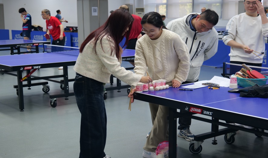 稍作休息后,趣味乒乓球赛闪亮登场。本次趣味赛共设置了颠球障碍赛、筷子夹球接力和定点发球积分3个项目,吸引了众多师生踊跃报名,共有28人参与到这场趣味十足的乒乓球盛宴中。