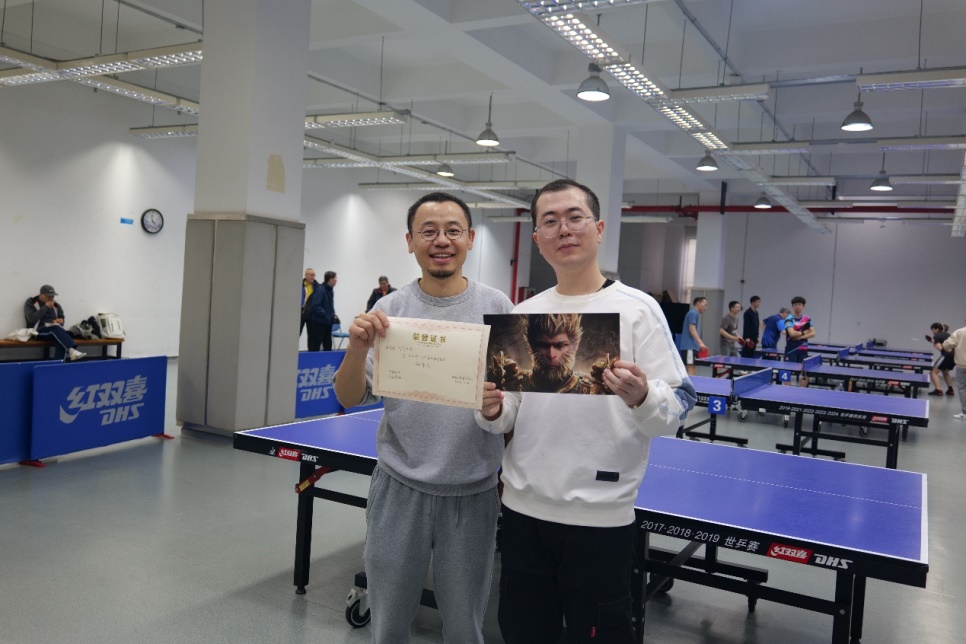 经过了3个小时的激烈角逐,各项比赛的结果陆续揭晓。系里的老师们分别为获奖选手和队伍颁发奖品和证书,表彰他们在比赛中的优异表现。在双打决赛中,两组实力强劲的队伍巅峰对决,最终武翔瀛-曾梓睿组凭借出色的配合和精湛的技术,赢得了比赛的胜利,夺得了双打比赛的冠军。陈瑞波-张沁组与孟祥煜-刘春楠组分别获得了双打比赛的亚军与季军。趣味乒乓球赛根据各项目积分总和,也评选出了积分前四的选手,孟祥煜、邢博文、刘洁、高一波四位同学在三个趣味项目中展现出了非凡的实力和独特的技巧,获得了趣味奖。