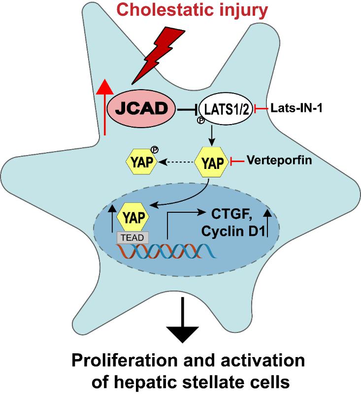 图-1. 胆汁淤积性肝损伤时JCAD通过HIPPO-YAP信号通路介导肝星状细胞活化与增殖的机制示意图