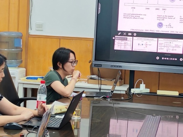 在交流讨论环节,大家热情高涨,大二本科生高翊方同学对吴美玲博士的报告进行提问,吴美玲一一作了解答。大四本科生孟禹舟同学就活性氧和铁死亡的关系提出了许多问题,与霍凌杰进行了交流。华山医院陈坚主任、上海大学郭景康老师、上海交通大学医学院附属上海市第六人民医院陆凤杰、也参与了讨论,并表示期待通过科研创新和学科交叉,碰撞出更大的火花。讨论环节给同学们带来新的启发,提高了大家的学习兴趣和创新思维。