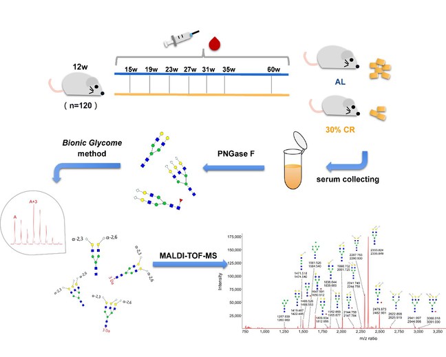 一些研究已发现N-糖链会随着年龄增长发生规律性改变,也与衰老相关的疾病有关,如一些癌症和代谢综合征。但衰老干预后血清蛋白糖组如何变化则缺少全面的研究,限制了对驱动衰老和衰老相关疾病背后糖链分子基础的深入研究。