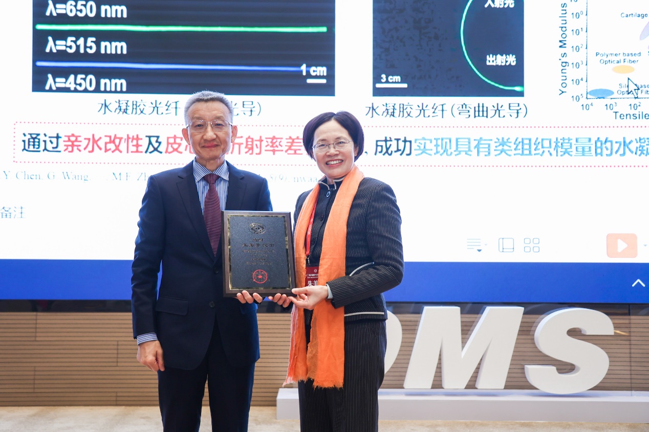 图:宋志坚教授为朱美芳院士颁发感谢牌